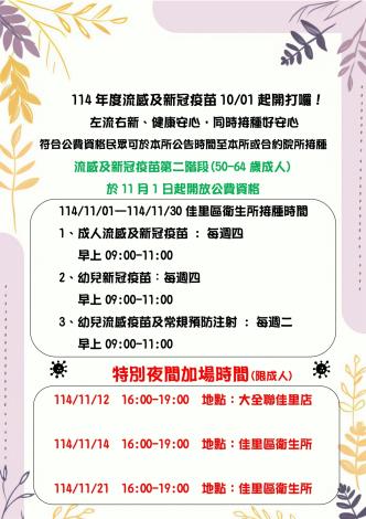 114/11/01—114/11/30 佳里區衛生所接種時間