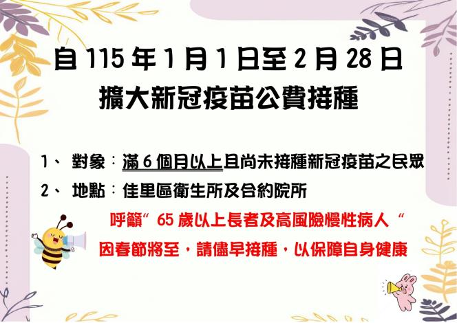 自115年1月1日至2月28日,擴大新冠疫苗公費接種對象為滿6個月以上且尚未接種新冠疫苗之民眾,皆可於期限內免費接種,以降低COVID-19重症及群聚感染風險。
